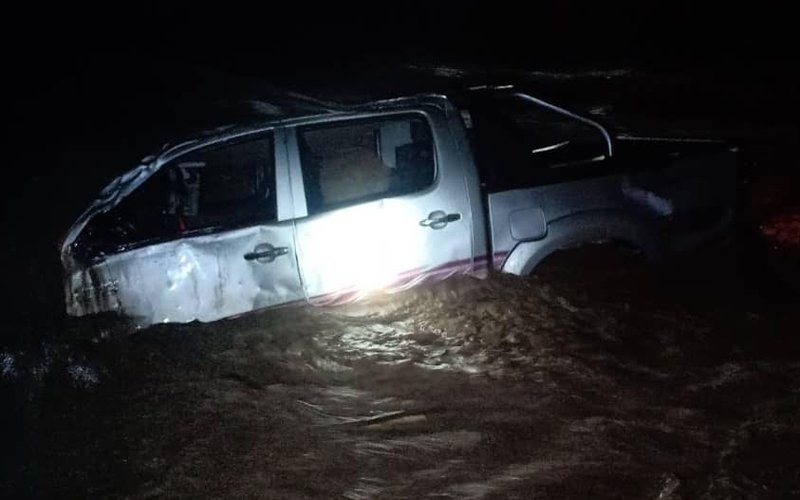 Toyota Hilux yang dinaiki 2 kanak-kanak hilang ditemui tidak jauh dari kawasan ia hanyut di Kampung Dangulad, Keningau awal pagi tadi. (Gambar Jabatan Bomba dan Penyelamat)