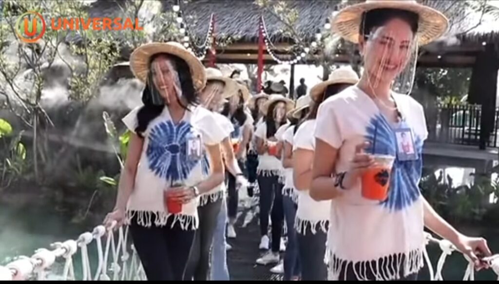 Kesemua wanita yang merupakan peserta Miss Thailand itu sedang berbaris di atas jambatan dengan memegang minuman sambil beraksi di hadapan kamera.