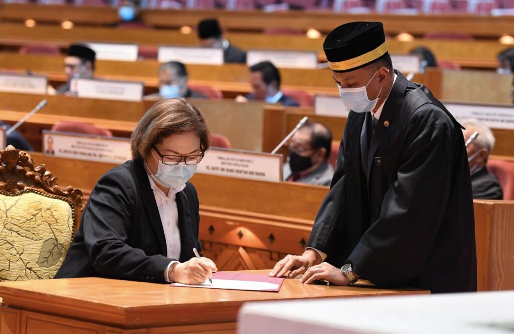 Datuk Christina Liew signing her Oath of Office as Api Api State Assemblywoman– Photo by Bernama