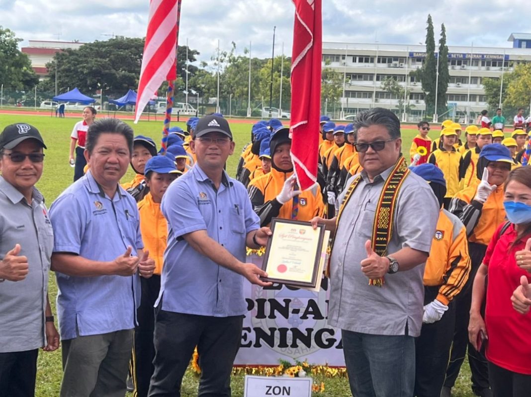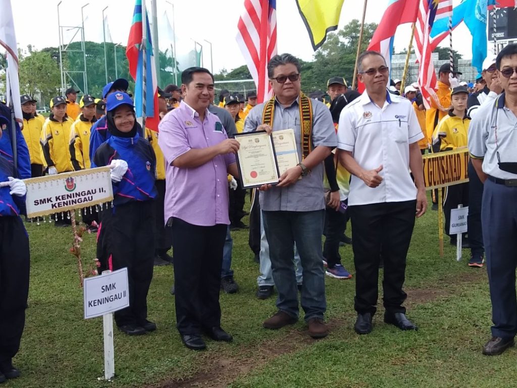Ellron menyampaikan sijil penghargaan kepada Ketua Kontigen perbarisan SMK Keningau 2.