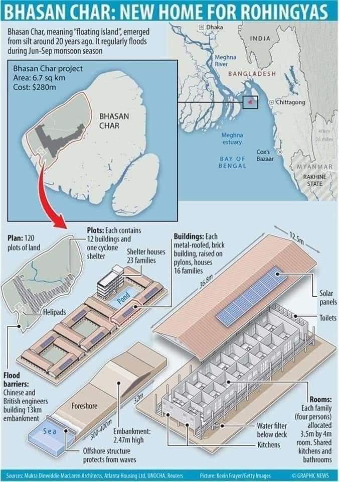 Projek Pusat Penempatan Pelarian Rohingya di Bhasan Char ini dapat menampung seramai 240,000 pelarian dengan kemudahan asas yang disediakan seperti bekalan air, elektrik dengan kuasa solar, klinik dan sekolah.