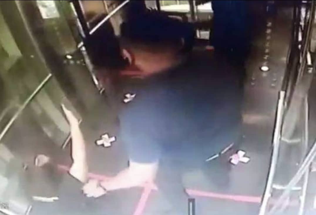 Imej tangkap layar daripada video tular yang menunjukkan seorang penjawat awam membelasah pegawai khidmat pelanggan wanita yang bertindak sebagai ejen cari jodoh dalam lif.