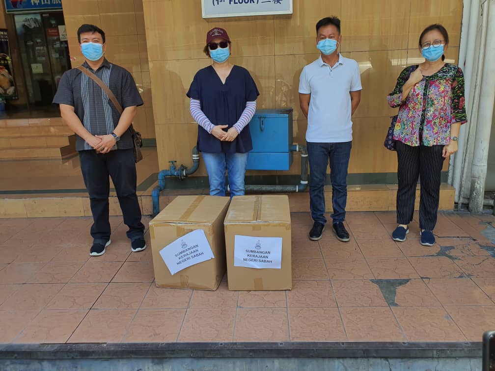 Photos – Datuk Christina Liew (2nd right) handing over a supply of face masks to Muguntan for the use of SJA members. Looking on are media representatives.