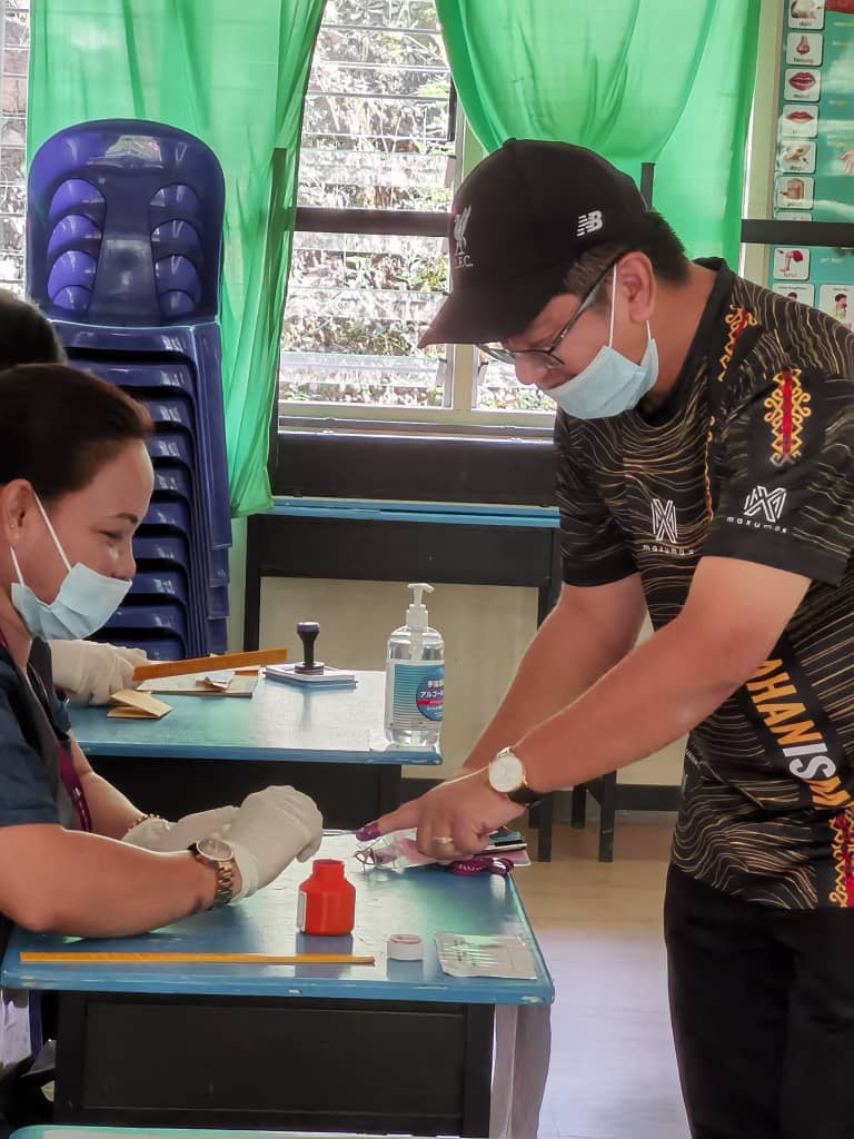 KOTA BELUD: Calon Pertubuhan Kinabalu Progresif Bersatu (UPKO) Dewan Undangan Negeri (DUN Kadamaian) Datuk Ewon Benedick selesai menunaikan tanggungjawab sebagai pengundi berdaftar di pusat mengundi SK Kiau hari ini.