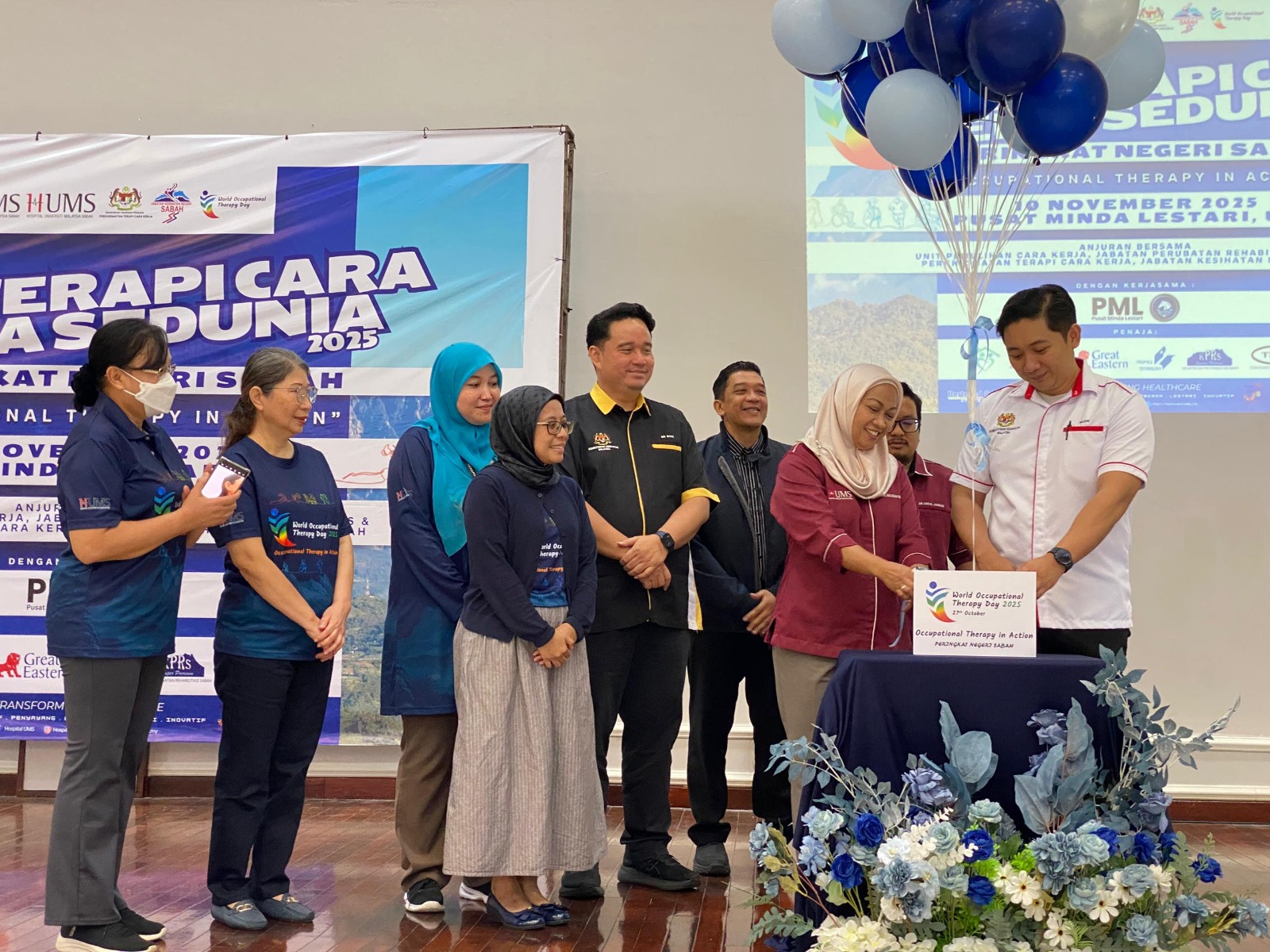 Malehah (depan dua kanan) dan Mohamed Yazir (depan tepi kanan) menyempurnakan gimik perasmian Hari Terapi Cara Kerja Sedunia peringkat Negeri Sabah 2025