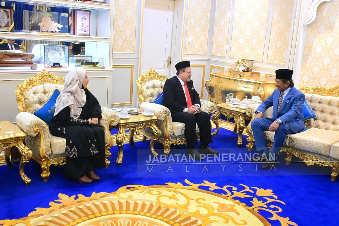 MESRA…Tun Musa (kanan) berbual mesra bersama Baharudin (tengah) di Istana Seri Kinabalu pada Rabu.