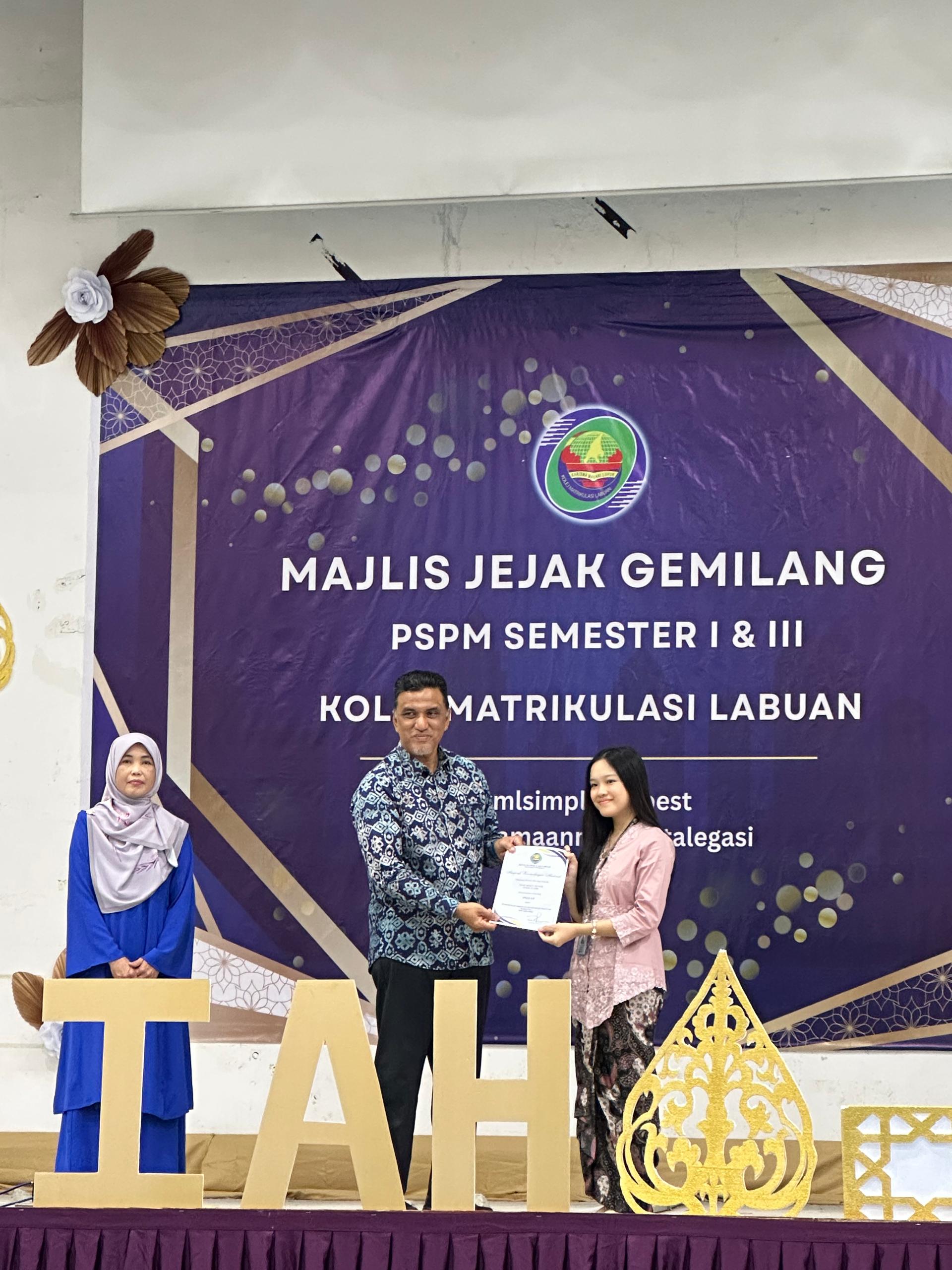 LABUAN: Seramai 536 pelajar diraikan dalam Majlis Jejak Gemilang PSPM Semester I dan III anjuran Kolej Matrikulasi Labuan yang berlangsung di dewan utama kolej itu, baru- baru ini.