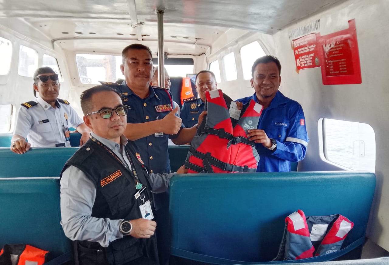 Alimuddin (tiga dari kanan) bersama Abd. Rahman (tiga dari kiri) dan Valentine (dua dari kiri) ketika membuat pemeriksaan di salah sebuah bot laju penumpang.