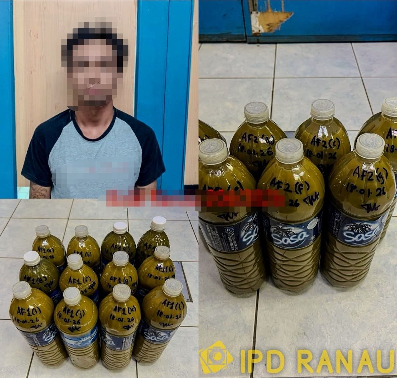 DITAHAN..Suspek yang ditahan bersama air ketum yang dirampas – Foto: IPD Ranau