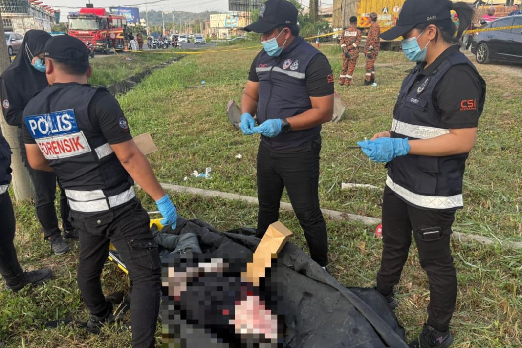 Anggota forensik polis menjalankan pemeriksaan di lokasi kejadian selepas penemuan mayat seorang lelaki
