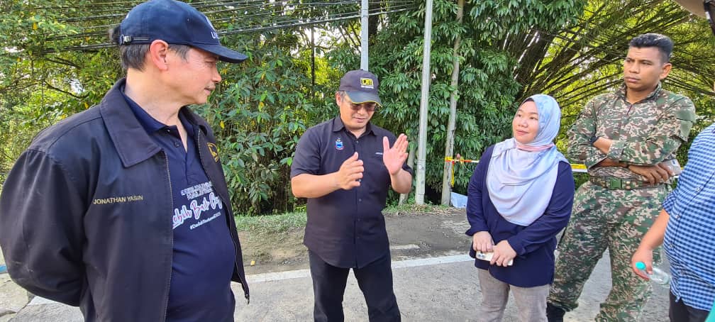 JUMAIN ( tengah) semasa meninjau lokasi jalan putus berhampiran Riverside Mart. Turut berada di lokasi, Ahli Parlimen Ranau, Datuk Jonathan Yasin (KIRI) , Jurutera Daerah, Alvonnah Farhanah (kanan) dan ADUN Paginatan, Datuk Abidin Madingkir.