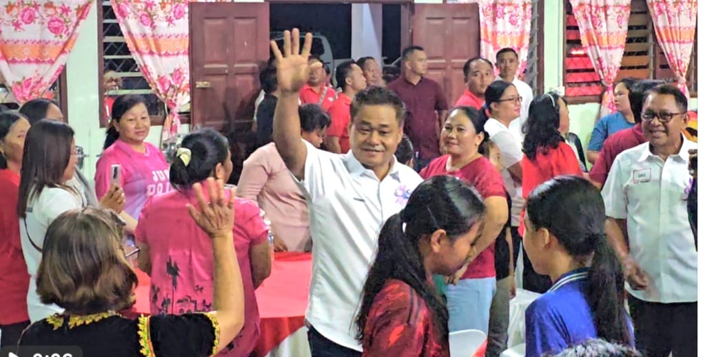 Masiung mengangkat tangan kepada warga kerja Kuamut di estat Sapi Nangoh sejurus tiba di majlis tersebut.