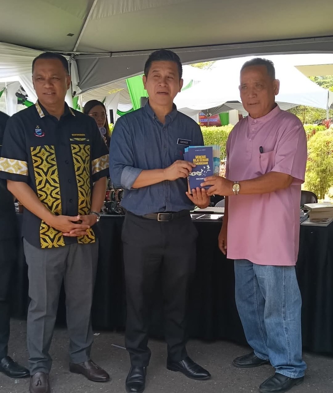 RJJ (kanan) menyerahkan 6 naskhah buku tulisan nya kepada George (tengah) sempena Karnival Gempak Literasi di Perpustakaan Negeri Tambunan.