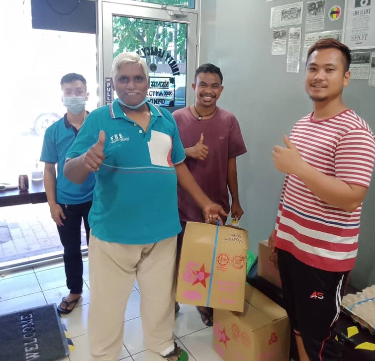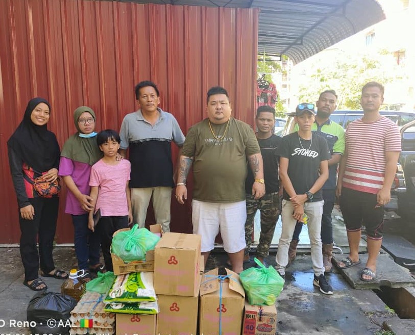 SERAH… Ah Ling (lima dari kanan) bersama rakannya menyerahkan sumbangan keperluan harian kepada Atim (empat dari kiri).