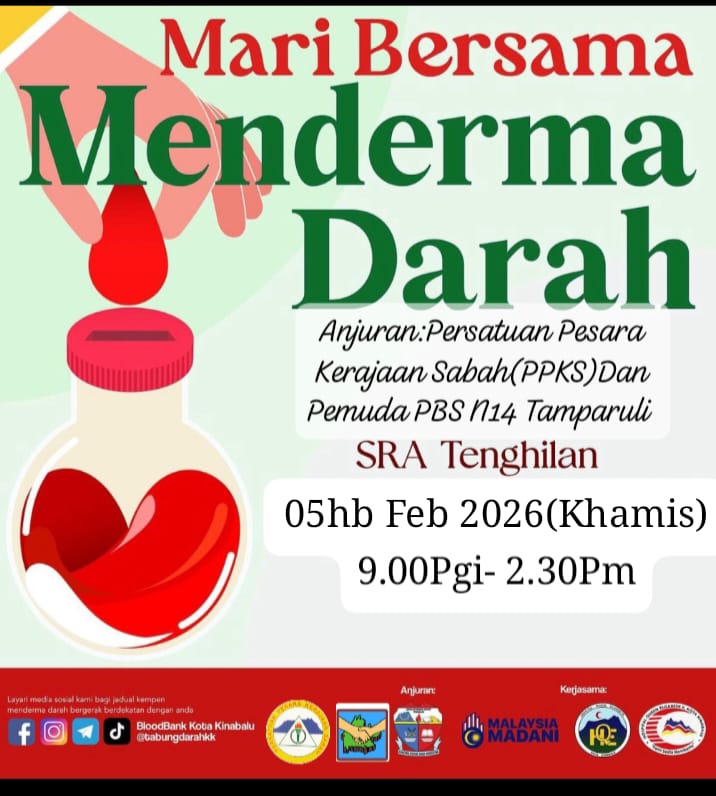 TENGHILAN: Orang ramai dijemput hadir beramai-ramai ke Program Derma Darah pada 5 Februari 2026 (Khamis) di Dewan SRA Tenghilan, bermula jam 9.00 pagi hingga 2.00 petang.
