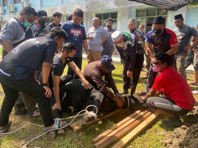KORBAN….Aktiviti penyembelihan lembu sedang dilaksanakan oleh Ustaz Junid Alling sambil dibantu oleh masyarakat setempat.