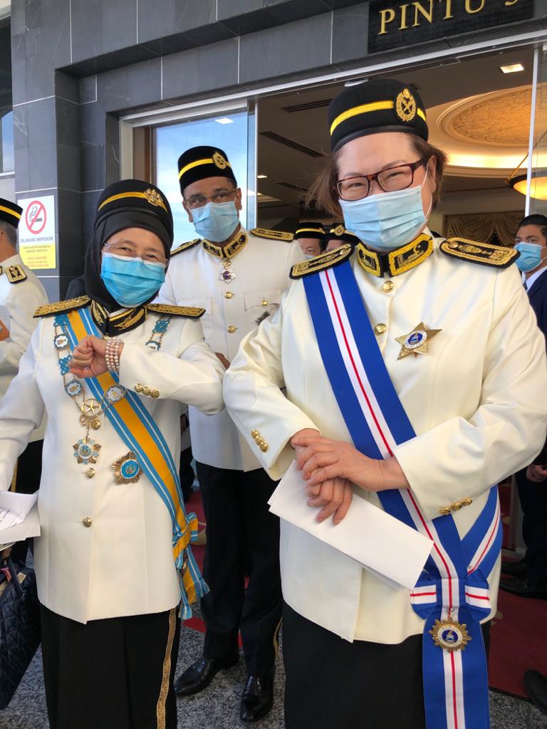 ELBOW BUMP…Sabah Deputy Chief Minister Datuk Christina Liew (right) and former Deputy Prime Minister Dato’ Seri Dr Wan Azizah Wan Ismail practising an elbow bump as a safe alternative greeting when they met in Parliament in Kuala Lumpur on Monday.