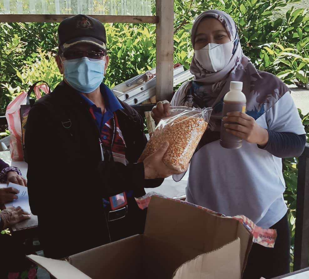 Salah seorang peserta (kiri) menerima Baja dan Biji Benih Jagung sumbangan Datuk Jonathan disampaikan kakitangan Koperasi Wawasan Sabah.